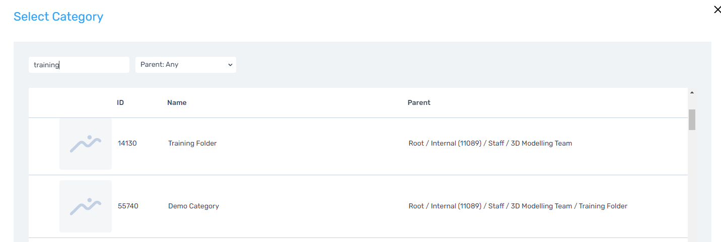 The 'Select Category' window will appear. Search to locate and confirm the category that you wish for the new Virtual Products to be created within.